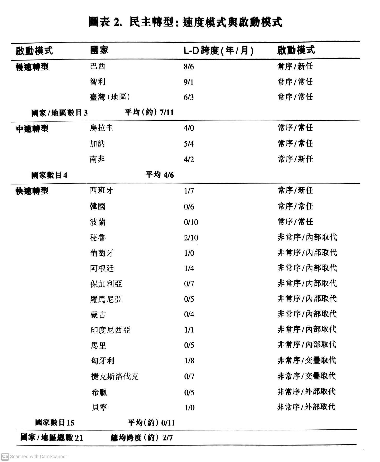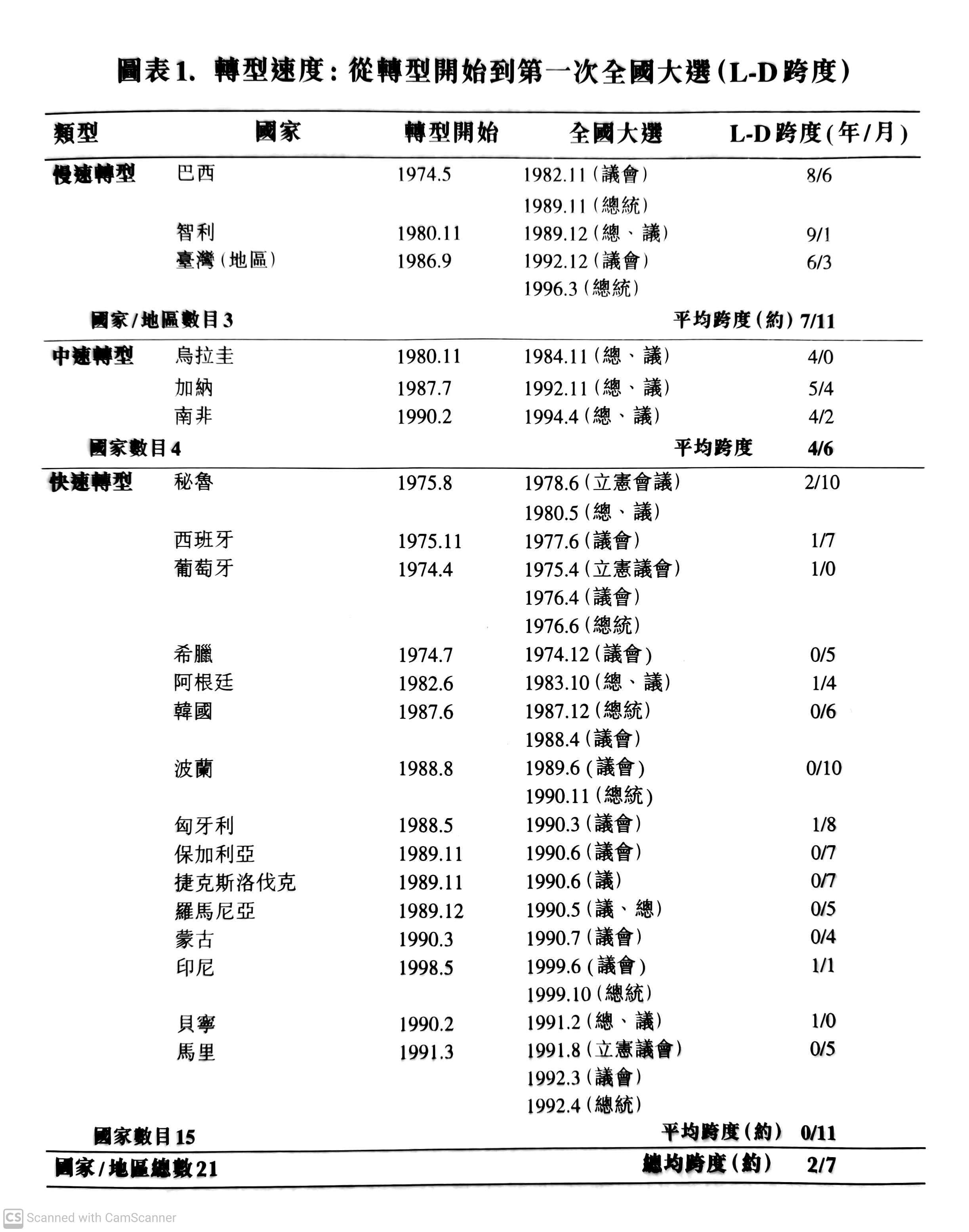 p40-41 為什麼要以 L-D 跨度即從轉型開始亦即自由化到第一次全國大選所經歷的時間為基準劃分速度類型呢?有三個理由:首先是因為從自由化到第一次全國大選的間隔時間越長,轉型過程也就越長,而從自由化過渡到民主化是轉型過程的核心,最能體現轉型的節奏;其次,第一次選舉具有特殊的重要性,通常被稱為“奠基性選舉” (founding election),在很大程度上能左右轉型過程的議程,本書後面將談到如果奠基性選舉不是全國選舉,對於有族群分裂問題的國家是非常危險的;再次,儘管第一次全國選舉的舉行並不一定就等於民主轉型的完成,但在大多數情況下,兩者要麼一致、要麼相差不遠。