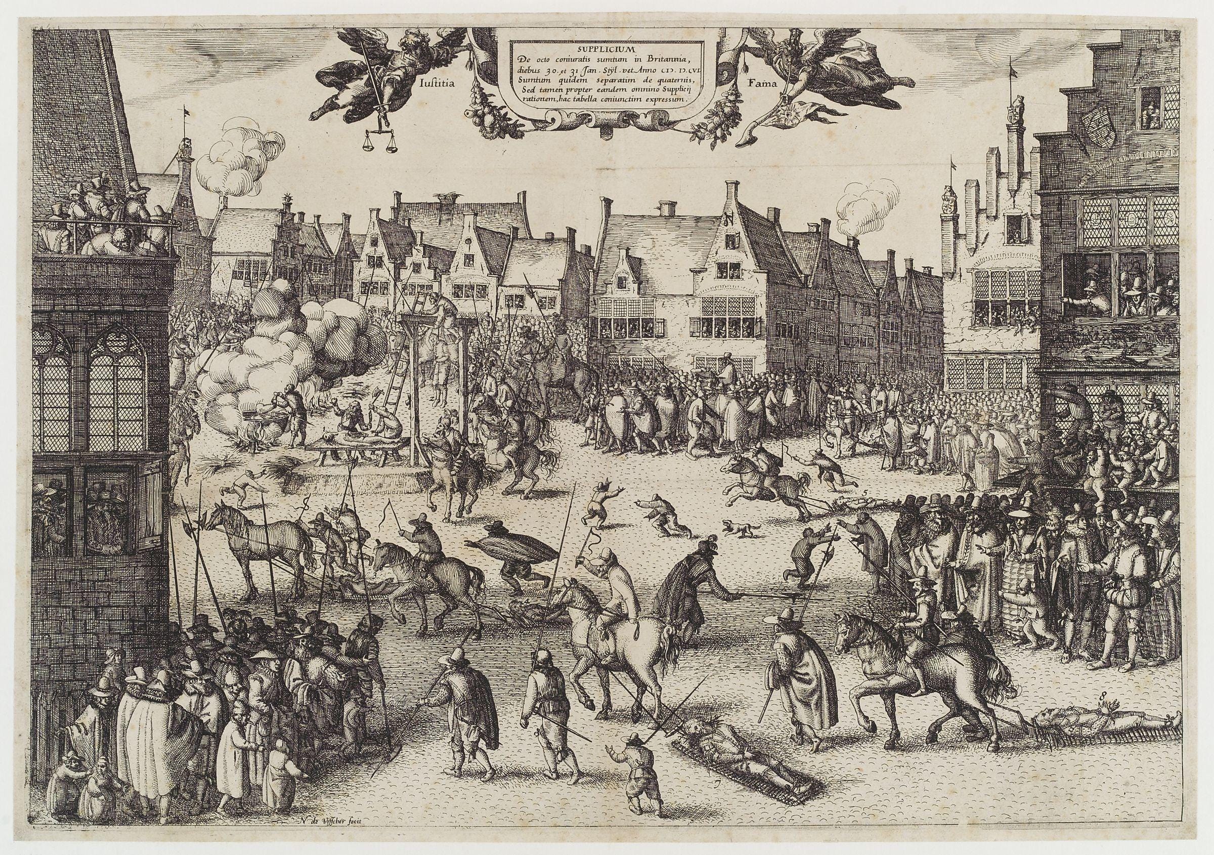 图中内容是1605年一场失败的政治阴谋(Gunpowder Plot)的清算场景。斯图亚特王朝统治期间,也零星出现过一些政治阴谋,但总体不是太成气候,政局算的上是一碗温吞水。