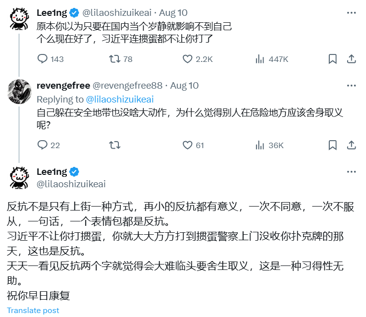 至于“推翻”,“造反”这些词,我现在第一时间能想到的相关说法是“习得性无助”,一提改变就直接跳到大开大合、革命战争、血流成河,是一种极其粗陋的认识。而且印象里,进入21世纪以来实际上全世界都非常少见通过武装革命达成较稳定的民主化的案例。
