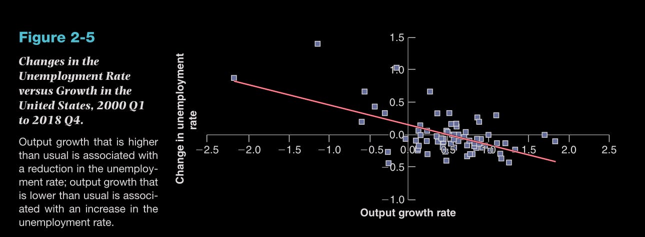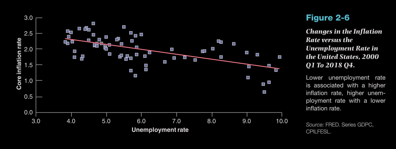 这就像我们参看如下图,这是两个在经济学领域成名已久的理论,就是描述失业率和通胀存在负相关,失业率和经济增长存在负相关的两条曲线。宏观来看,趋势是存在的,但是趋势不是一种绝对规律,离这条拟合线很远的单点也存在,反映在我们的生活中就是,你完全有可能发现自己处于一个和理论模型的预测差很远的社会里。这不能代表统计学意义上来讲,理论所预测的那种关系不存在;但是统计学意义上的相关性,和我们用社会科学的语言讨论“充分”和“必要”时,和我们试图理解自己身处的生活时,并没有一种简单明了的对应关系。